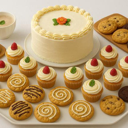 8” cake (24 servings) 15 cookies, 18 cupcakes: $278